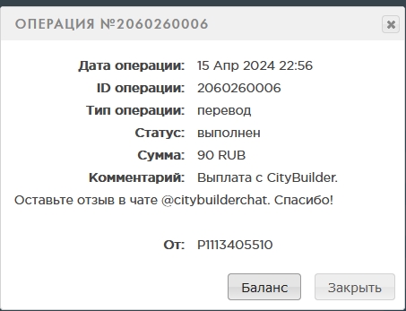 Комментарий: Выплата с CityBuilder. Оставьте отзыв в чате @citybuilderchat. Спасибо